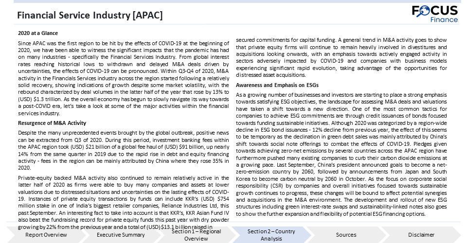 Since APAC was the first region to be hit by the effects of COVID-19 at the beginning of 2020, we have been able to witness the significant impacts that the pandemic has had on many industries - specifically the Financial Services Industry. From global interest rates reaching historical lows to withdrawn and delayed M&A deals driven by uncertainties, the effects of COVID-19 can be pronounced. Within Q3-Q4 of 2020, M&A activity in the Financials Services industry across the region started following a relatively solid recovery, showing indications of growth despite some market volatility, with the rebound characterized by deal volumes in the latter half of the year that rose by 13% to (USD) $1.3 trillion. As the overall economy has begun to slowly navigate its way towards a post-COVID era, let’s take a look at some of the major activities within the financial services industry.