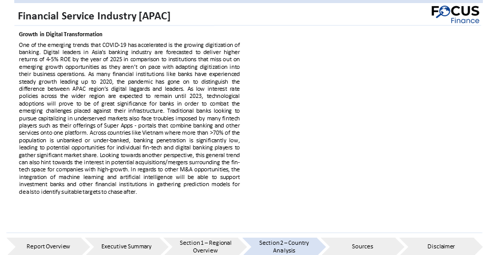 One of the emerging trends that COVID-19 has accelerated is the growing digitization of banking. Digital leaders in Asia’s banking industry are forecasted to deliver higher returns of 4-5% ROE by the year of 2025 in comparison to institutions that miss out on emerging growth opportunities as they aren’t on pace with adapting digitization into their business operations. As many financial institutions like banks have experienced steady growth leading up to 2020, the pandemic has gone on to distinguish the difference between APAC region’s digital laggards and leaders. As low interest rate policies across the wider region are expected to remain until 2023, technological adoptions will prove to be of great significance for banks in order to combat the emerging challenges placed against their infrastructure. Traditional banks looking to pursue capitalizing in underserved markets also face troubles imposed by many fintech players such as their offerings of Super Apps - portals that combine banking and other services onto one platform. Across countries like Vietnam where more than >70% of the population is unbanked or under-banked, banking penetration is significantly low, leading to potential opportunities for individual fin-tech and digital banking players to gather significant market share. Looking towards another perspective, this general trend can also hint towards the interest in potential acquisitions/mergers surrounding the fin-tech space for companies with high-growth. In regards to other M&A opportunities, the integration of machine learning and artificial intelligence will be able to support investment banks and other financial institutions in gathering prediction models for deals to identify suitable targets to chase after